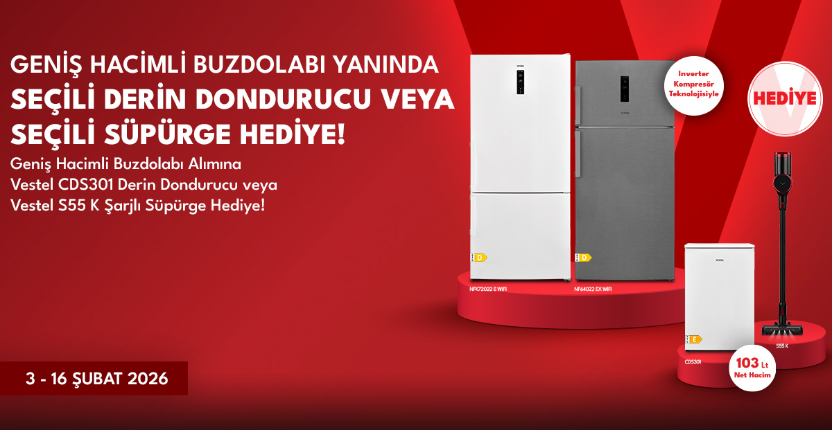 • İlgili kampanya, kampanya dâhili kod listesinde belirtilen ürünler için geçerli olup; seçili buzdolabı alımında Vestel CDS301 Üç Çekmeceli Derin Dondurucu ya da Vestel S55 Dik Tip Şarjlı Süpürgenin de sepete eklenmesi halinde derin dondurucu veya şarjlı süpürge ürünlerinden biri hediye edilecektir.