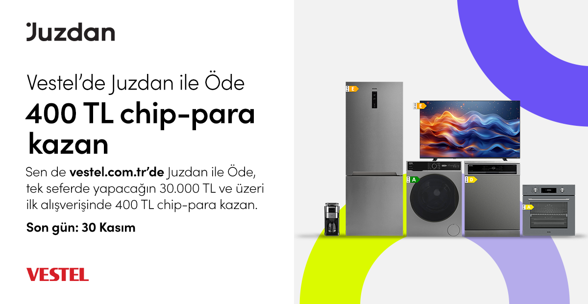 • Juzdan ile Öde’ye özel Vestel.com.tr’de 1 – 30 Kasım 2025 tarihleri arasında “Juzdan ile Öde” seçilerek tek seferde yapacağınız 30.000 TL ve üzeri ilk alışverişinize 400 TL chip-para fırsatı sunulmaktadır.