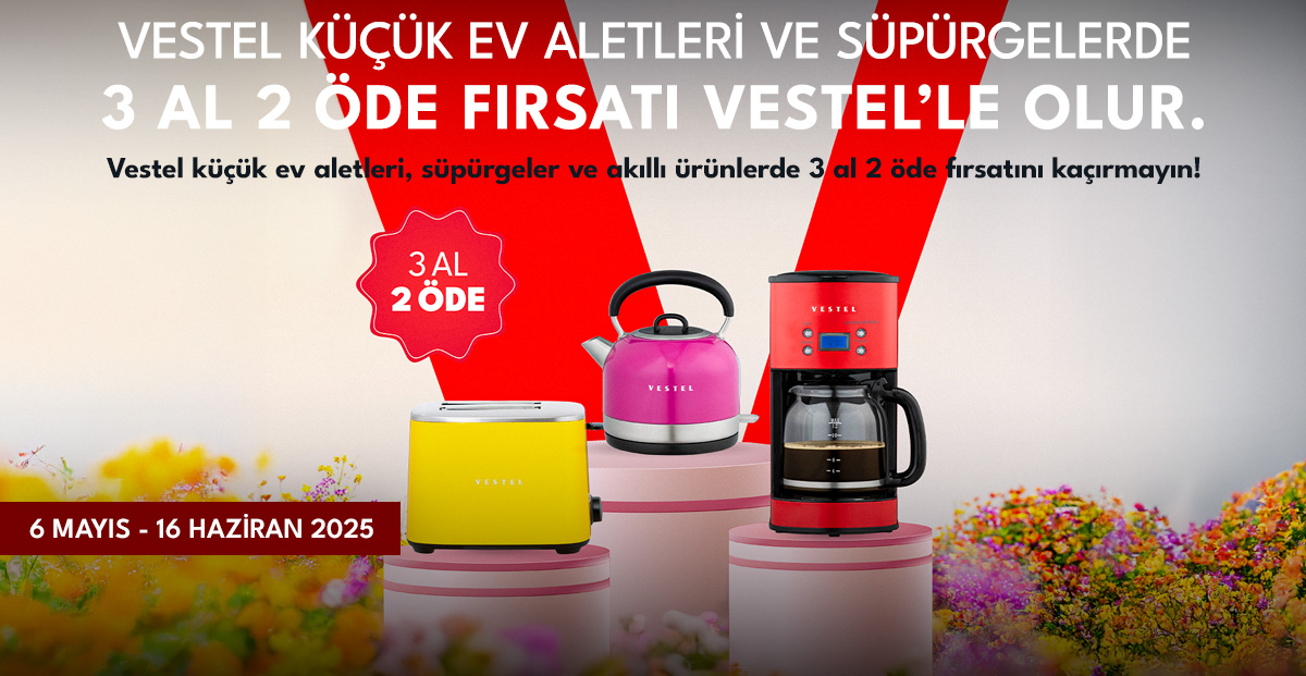 SEÇİLİ KÜÇÜK EV ALETİ, SÜPÜRGE, SET ÜSTÜ OCAK VEYA ASPİRATÖR ÜRÜNLERİNDEN İKİSİNİ ALANA, HEDİYESİ VESTEL'DE !