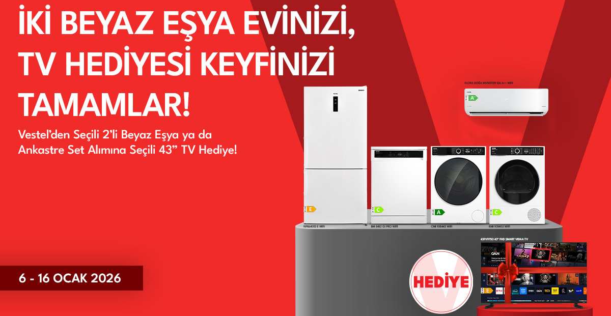 • Kampanya 6-16 Ocak 2026 tarihleri arasında kampanyaya katılan Vestel yetkili satıcıları, Vestel kurumsal mağazaları ya da vestel.com.tr’den alınan seçili ürünlerde geçerlidir.