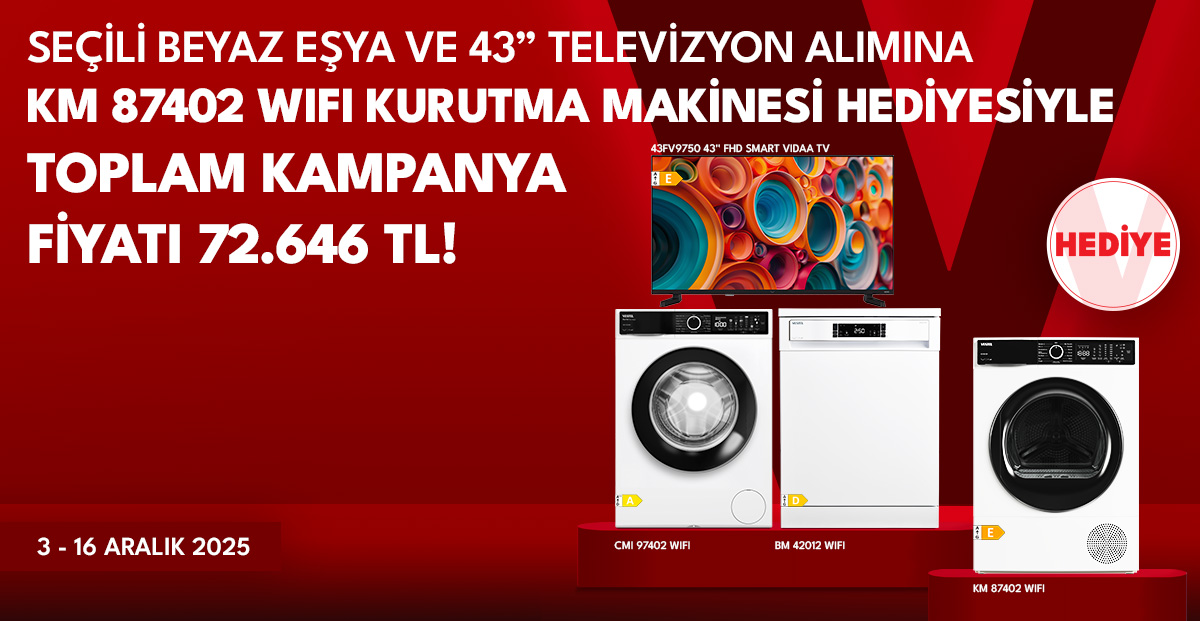 Seçili Beyaz Eşya ve 43” Televizyon Alımında KM 87402 WIFI Kurutma Makinesi Hediyesiyle Toplam Kampanya Fiyatı 72.646 TL!