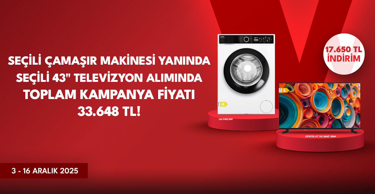 • Kampanya stoklarla sınırlıdır. İlgili kampanya, kampanya dâhili kod listesinde belirtilen ürünler için geçerli olup; 3-16 Aralık 2025 tarihleri arasında Vestel üyelerine özel indirim kampanyası ile seçili çamaşır makinesi alımında seçili 43" televizyonlarda %50'ye varan indirim kapsamında 10.650 TL indirim kampanyasının birlikte uygulanmasını kapsamaktadır.