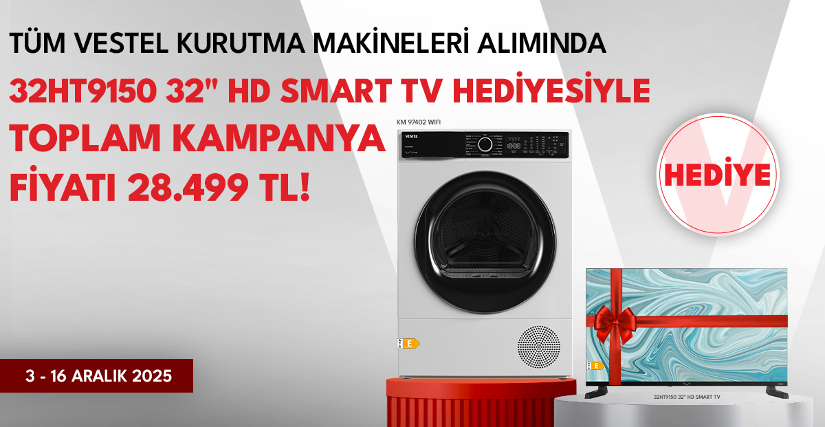Tüm Vestel Kurutma Makineleri Alımında 32HT9150 32" HD SMART TV Hediyesiyle Toplam Kampanya Fiyatı 28.499 TL!