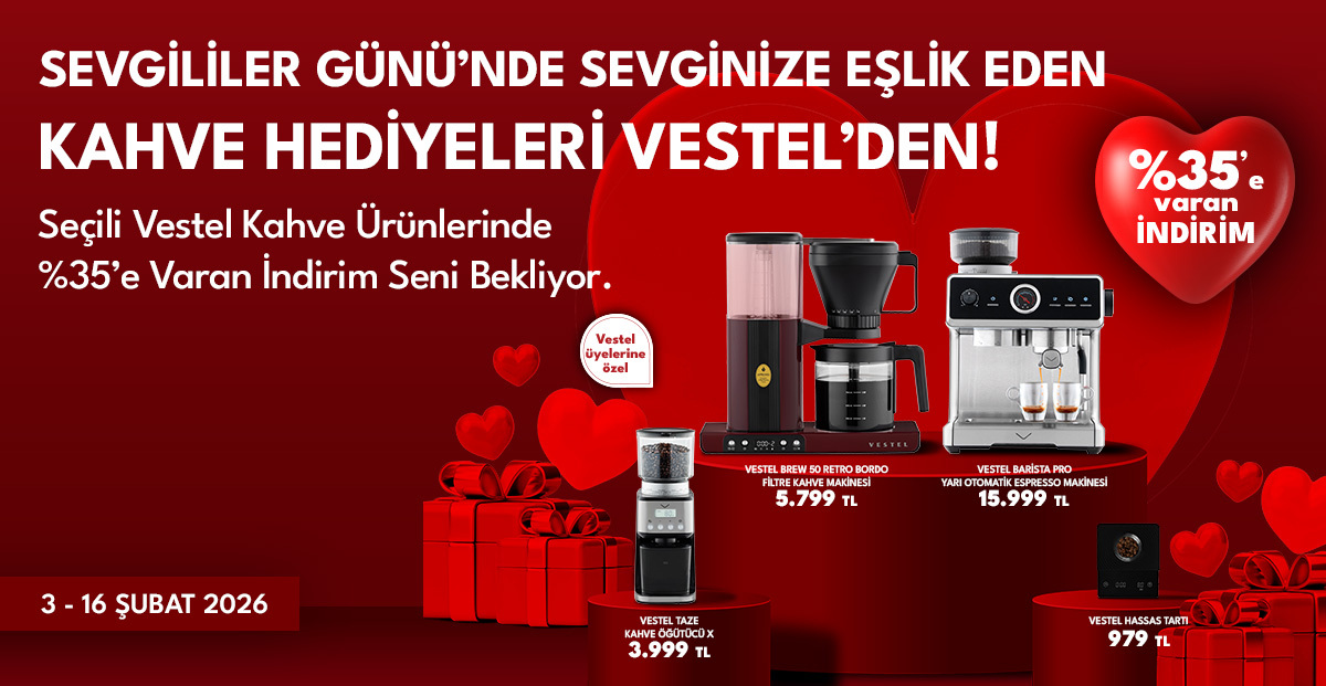 Kampanya 3 Şubat - 16 Şubat 2026 tarihleri arasında Vestel yetkili satıcıları, Vestel mağazaları ve vestel.com.tr’de satın alınan seçili kahve makineleri ve tamamlayıcı ürünlerde geçerlidir. Kampanya stoklarla sınırlıdır. Kampanyadan yalnızca vestel.com.tr üyeliği bulunan tüketiciler faydalanabilir. Üyeliği bulunmayan tüketiciler kampanyadan yararlanamaz.