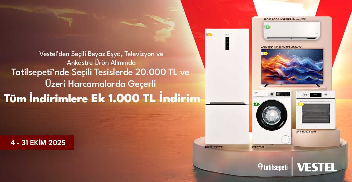 Ürünün montajı sonrası Vestel’den SMS ile Tatilsepeti’nde Seçili Tesislerde 20.000 TL ve üzeri harcamalarda geçerli tüm indirimlere ek 1000 TL indirim kodu gönderilecektir. İndirim kodu https://www.tatilsepeti.com’da 31.12.2025 tarihine kadar yapılan rezervasyonlarda ve 31.05.2026 tarihine kadar yapılan konaklamalarda geçerlidir.