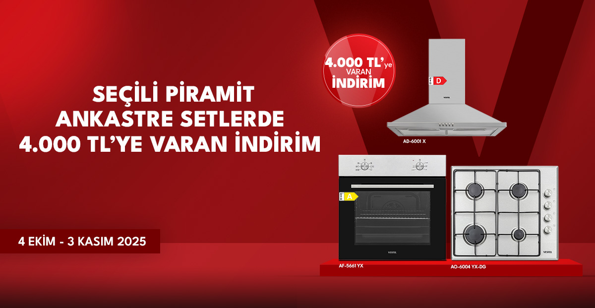 • Kampanya indirimi Vestel üyeleri için ekim ayı tavsiye edilen Vestel üye perakende satış tutarı üzerinden dahili kod listesinde bulunan seçili zamanlayıcısız ankastre fırın, seçili emaye ankastre ocak ve seçili piramit tip ankastre davlumbaz ürünlerinden oluşan Vestel 3’lü ankastre set alımında 4.000 TL'ye varan indirim uygulanacaktır. Vestel üye perakende fiyatı 4 Ekim - 3 Kasım 2025 tarihleri arasında kampanya dahili seçili ürünlerde geçerlidir.