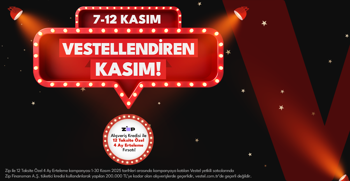 Zip ile 12 Taksite Özel 4 Ay Erteleme kampanyası 1-30 Kasım 2025 tarihleri arasında kampanyaya katılan Vestel yetkili satıcılarında Zip Finansman A.Ş. tüketici kredisi kullandırılarak yapılan 200.000 TL’ye kadar olan alışverişlerde geçerlidir, vestel.com.tr’de geçerli değildir. Detaylar için tıklayınız.